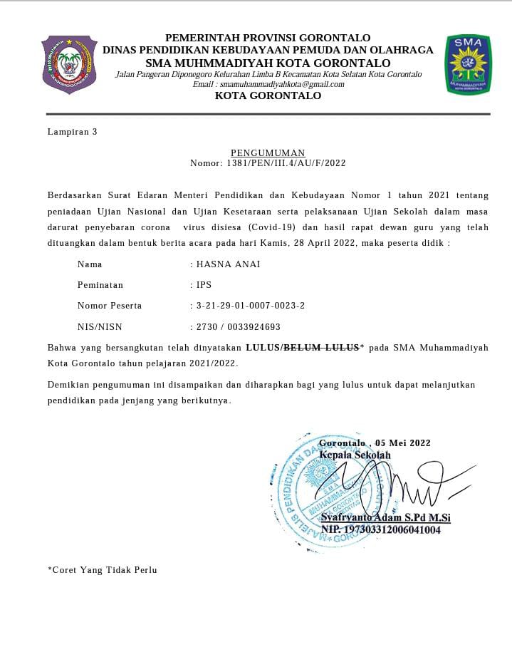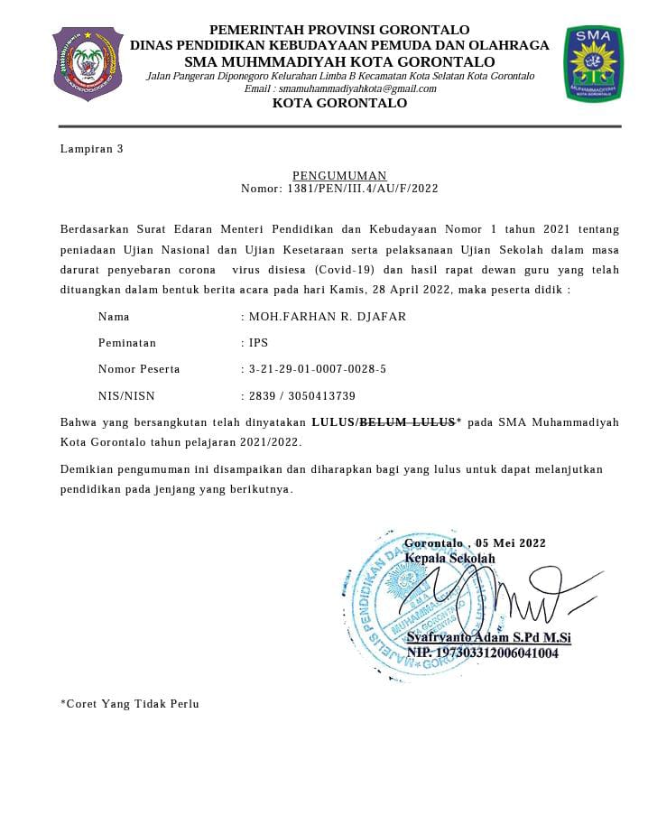 Pengumuman Kelulusan SMA Muhammadiyah Kota Gorontalo Tahun Pelajaran 2021-2022.
