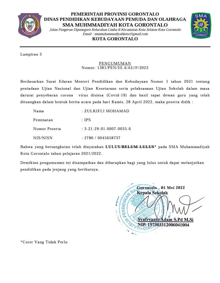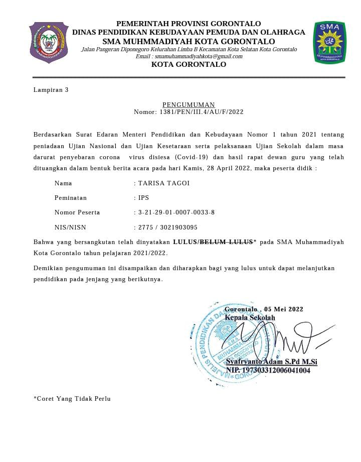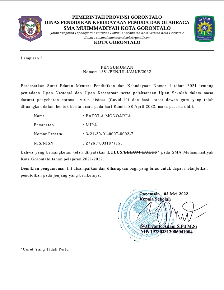 Pengumuman Kelulusan SMA Muhammadiyah Kota Gorontalo Tahun Pelajaran 2021-2022.