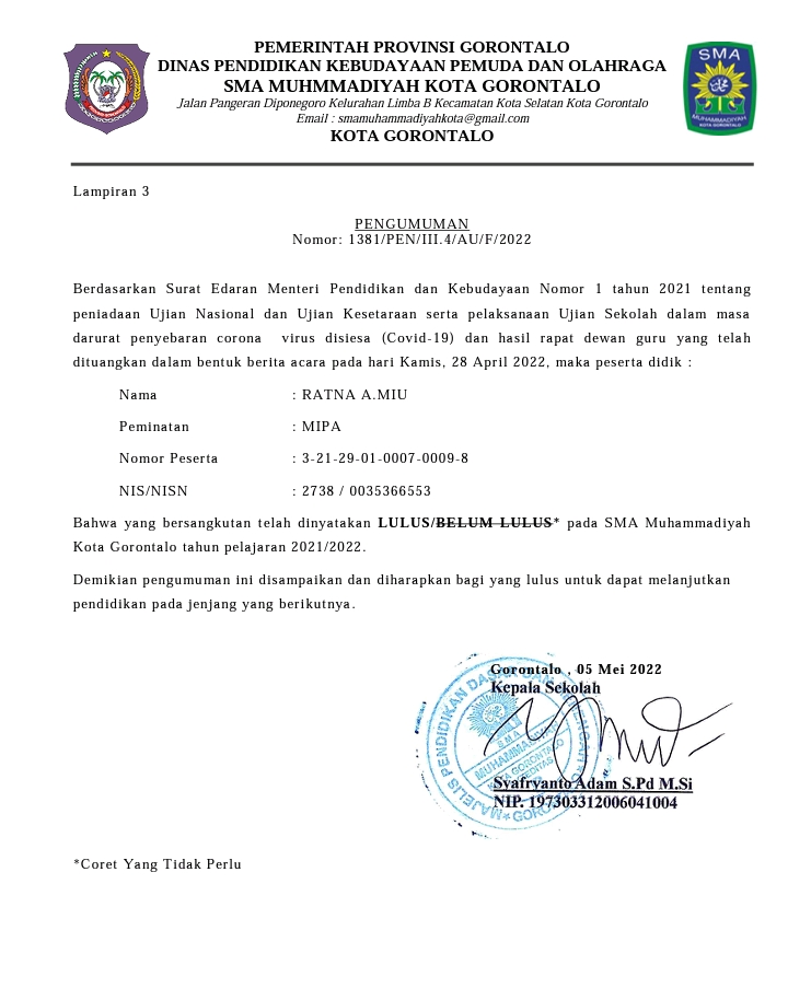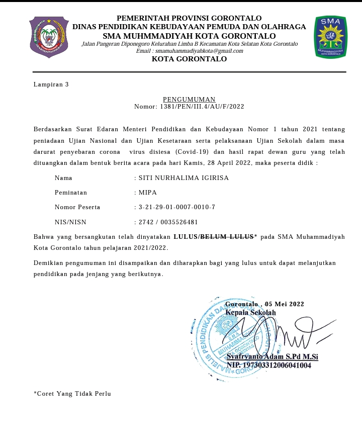 Pengumuman Kelulusan SMA Muhammadiyah Kota Gorontalo Tahun Pelajaran 2021-2022.